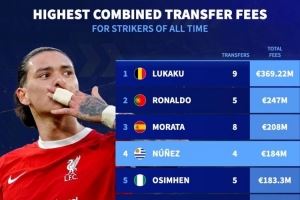 体育资讯8月11日讯 德国转会市场统计了前锋累计转会费,并列出榜单,卢卡库3.6922亿欧居首,C罗、莫拉塔、努涅斯排名前四。